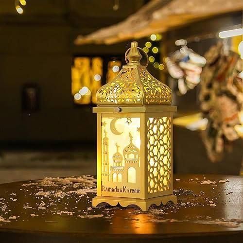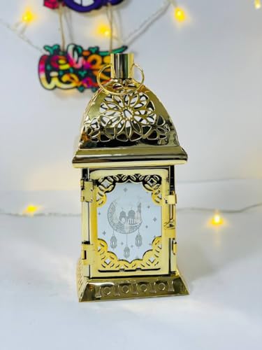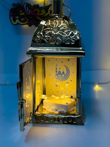 - التصميم الإسلامي الأنيق: فانوس معدني مربع الشكل بزخارف إسلامية تقليدية تتضمن الهلال والمسجد والنجوم، مثالي لديكور رمضان والمناسبات الدينية