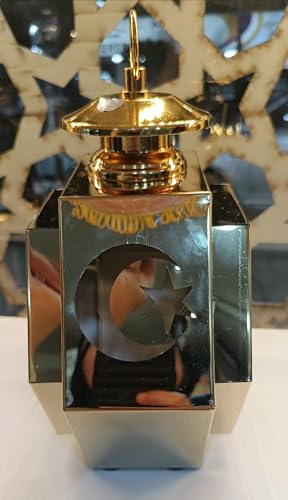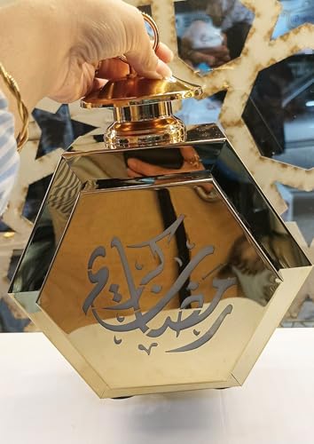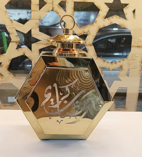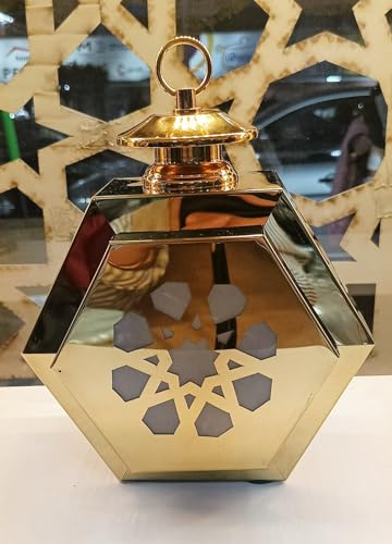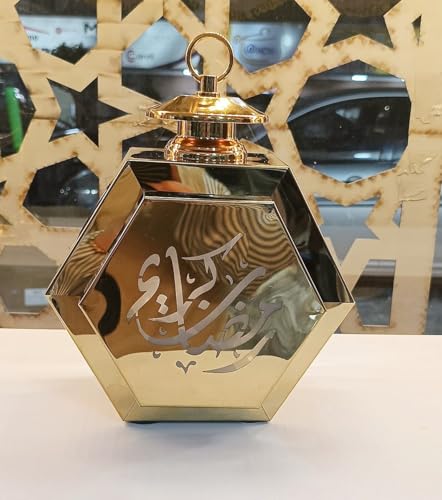 Generic - فانوس رمضان استانلس ستيل ذهبي، شكل سداسي مع نقوش عربية، ديكور إسلامي فاخر