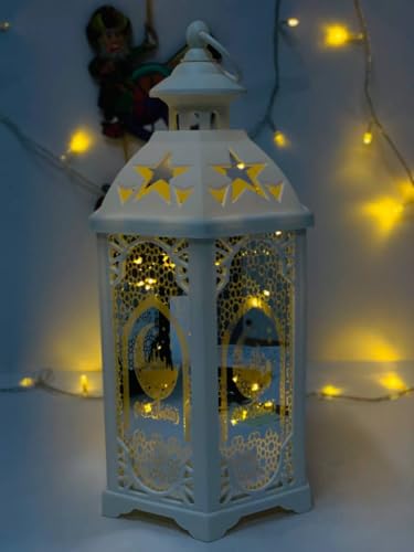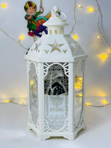 Generic - فانوس رمضان المضيء، هيكل سداسي أبيض، زجاج مزخرف ونقوش رمضانيه، 34 سم، إضاءة LED مع USBويعمل بالحجارة ايضا، تصميم للديكور الرمضاني