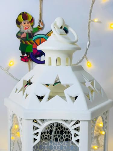 - التصميم: فانوس سداسي الشكل مصنوع من الأبيض مع زخارف نجمية وتفاصيل هندسية جميلة