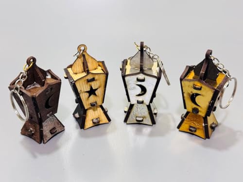 - تصميم فانوس رمضاني: ميدالية مفاتيح على شكل فانوس رمضان تقليدي مصنوع من الخشب بتصاميم متنوعة تحمل رموز الهلال والنجمة