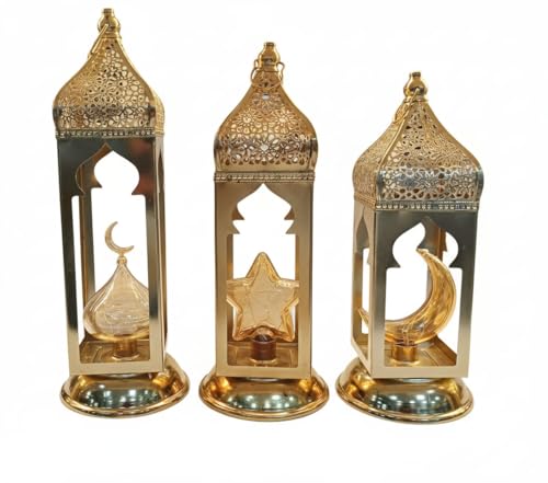 - مجموعة فاخرة: طقم من 3 فوانيس رمضانية ذهبية بتصميم مغربي أصيل مع نقوش دقيقة وزخارف تقليدية