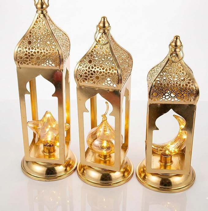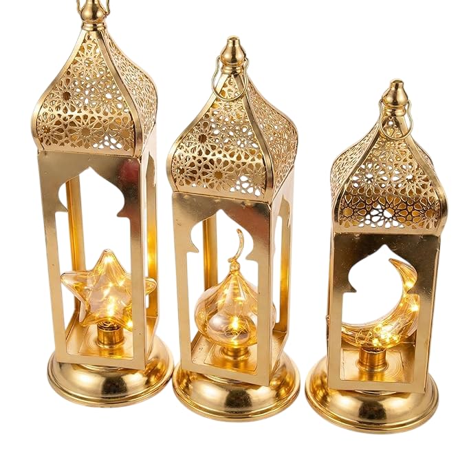 Generic - طقم فوانيس رمضان ذهبي، 3 قطع، معدن فاخر، تصميم نجمة وهلال، ديكور تقليدي عصري