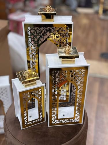 LC - طقم فوانيس رمضان من 3 قطع - خشب * معدن - مقاسات 44 * 21 و 33 * 16 و 24 * 12 - ديكور رمضان - ابيض مع ذهبي