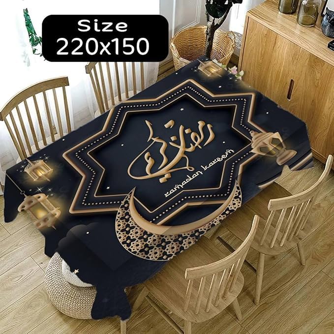 Generic - مفرش طاولة وسفرة لشهر رمضان مودرن 4D - مشمع ثقيل مقاوم للماء والبقع - تصميم فوانيس وهلال ذهبي - مقاس 220×140 سم -اصنع لمسة شهر رمضان السحرية علي مائدتك