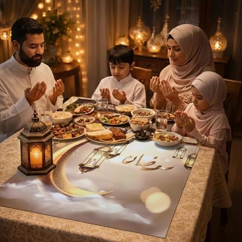- متعدد الاستخدامات: مثالي كمفرش طاولة أو كقطعة ديكورية لتزيين المنزل خلال شهر رمضان والمناسبات الإسلامية، سهل العناية والتنظيف