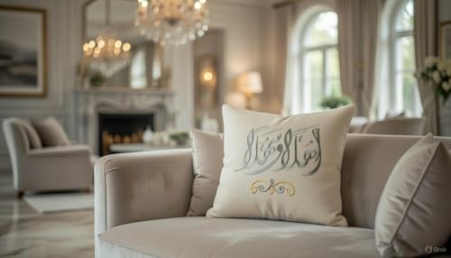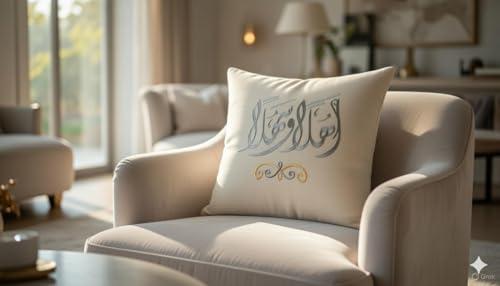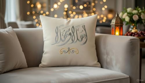 - التصميم الرمضاني: غطاء وسادة بتطريز عربي أنيق يحمل عبارة "اهلا وسهلا" مع رسم منزل بخيوط ذهبية ورمادية، مثالي لإضفاء أجواء رمضانية دافئة على ديكور منزلك