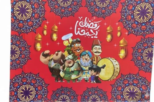 - تصميم رمضاني جذاب: يتميز بخلفية حمراء نابضة بالحياة مع شخصيات كرتونية مرحة وزخارف إسلامية تقليدية وفوانيس رمضانية ذهبية