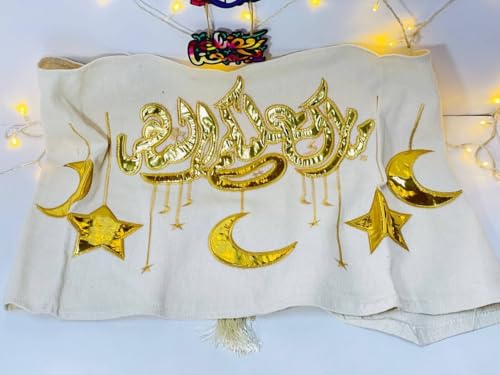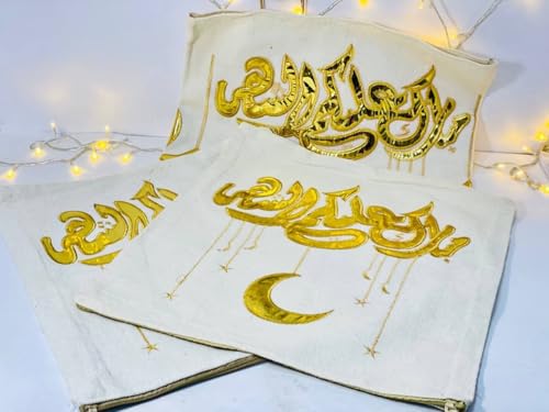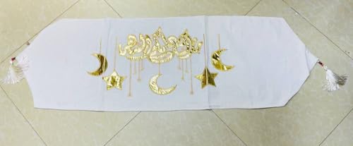 Generic - طقم رانر رمضاني مطرز بتصميم إسلامي، قماش كتان مع تطريز ذهبي، يتضمن رنر 135×45 سم وكيس مخدتين 42×45 سم، 3 قطع، لأجواء رمضان 2026