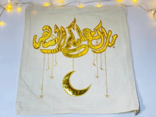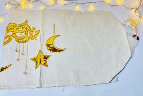 - تصميم إسلامي مطرز: مزين بتطريز ذهبي أنيق بنقوش إسلامية تقليدية تضفي لمسة روحانية وجمالية على ديكور المائدة والمنزل