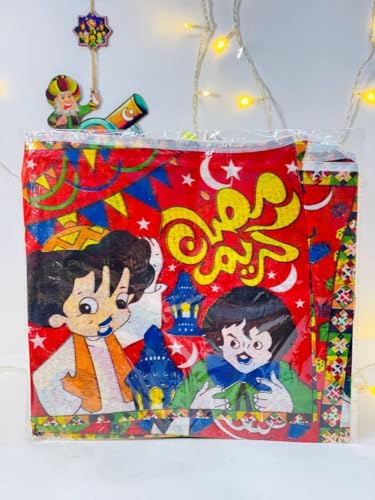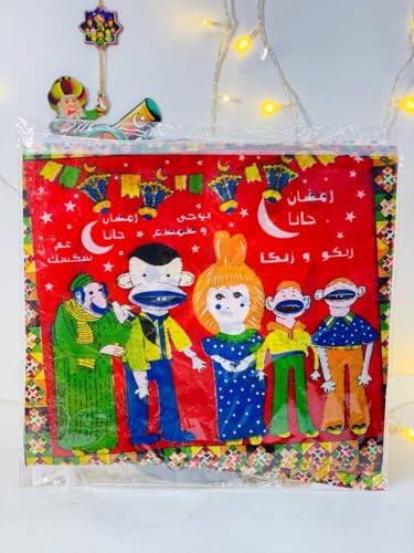 - ألوان نابضة بالحياة: تتميز بألوان حمراء وصفراء وخضراء مع شخصيات كرتونية محببة وزخارف رمضانية تقليدية