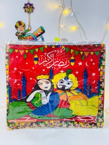 - تصميم احتفالي: زينة رمضانية مربعة الشكل بألوان زاهية ورسومات كرتونية مبهجة تضفي أجواء احتفالية مميزة