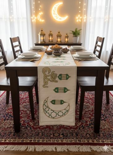 Generic - مفرش طاولة رمضان 140×45 سم - مزيج من الكتان والقطن - تصميم هلال اسلامي انيق - ديكور طاولة الطعام لشهر رمضان (مطرز باللونين الذهبي والاخضر)