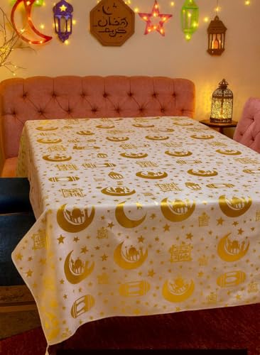 Generic - مفرش طاولة رمضان بتصميم هلال ونجوم ذهبي، 150 سم × 100 سم، مفرش سفرة بزخارف إسلامية