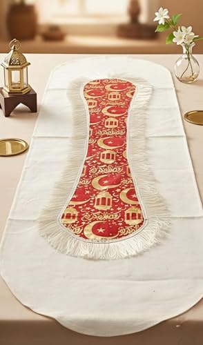 - تصميم رمضاني فاخر: عداء طاولة بتصميم إسلامي أنيق يتميز بزخارف الهلال والنجوم والفوانيس باللون الأحمر والذهبي، مثالي لتزيين طاولة الإفطار والسحور