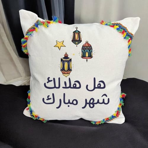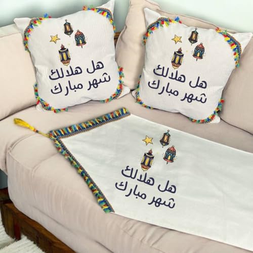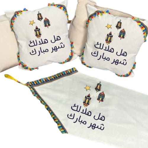 LC - مفرش طاولة رمضان (مجموعة من مخدتين + مفرش طويل) - طباعة على جانب واحد - تصميم رمضان هل هلالك شهر مبارك