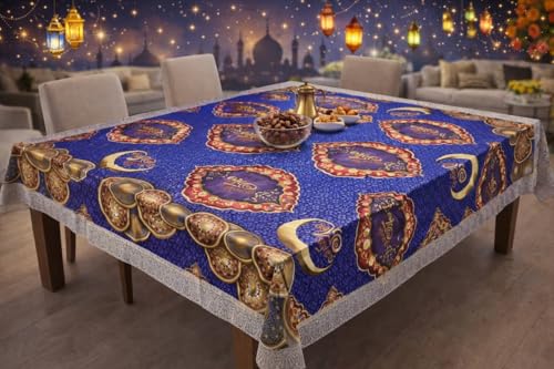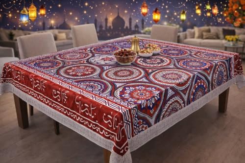 Generic - مفرش طاولة رمضاني بتصميم دوائر زخرفية، مشمع مبطن مع كنار، أحمر وأزرق، 183×137 سم/