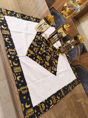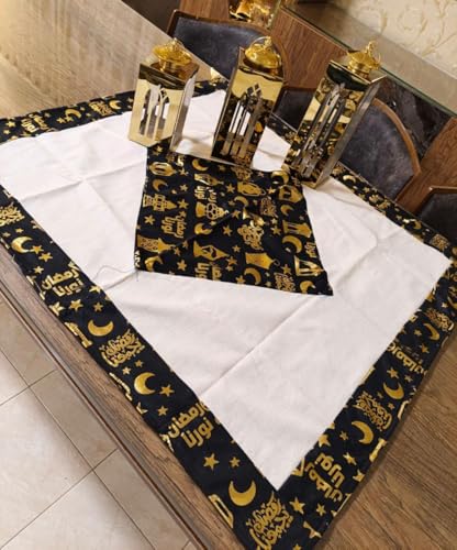 - مفرش طاولة رمضان، أبيض وأسود مع ذهبي، مطبوع بزخارف إسلامية، هلال ونجوم