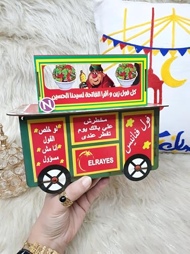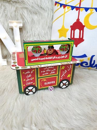- تم تصميم هذا الحامل لمحاكاة عربة الفول العربي التقليدية (فول المدفا)، ويتميز بألواح حمراء وخضراء وصفراء زاهية بالإضافة إلى الخط العربي الأصلي الذي يتمنى بركات رمضان، مما يحول على الفور موزع المناديل العادي إلى قطعة مركزية نابضة بالحياة وغنية ثقافيًا لأي تجمع.