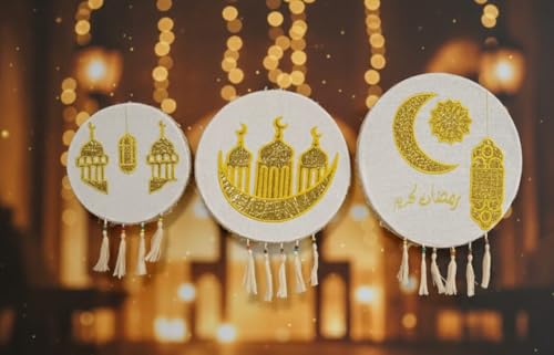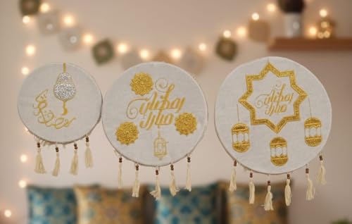 Generic - طقم ديكور حائط رمضانى (3قطع) , طارات خشبية مودرن بتصاميم قماش مطرزة , زينة رمضان للمنزل