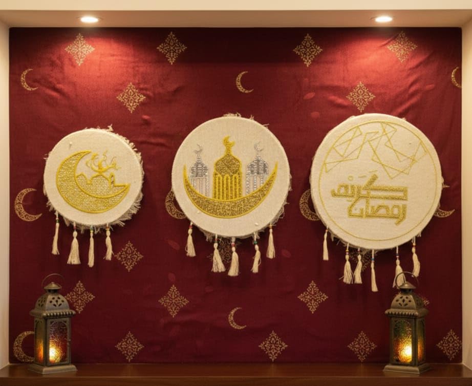 - طقم ديكور حائط رمضاني: يتضمن 3 قطع من الطارات الخشبية المودرن المزينة بتصاميم قماش مطرزة بخيوط ذهبية فاخرة تحمل عبارات وزخارف رمضانية