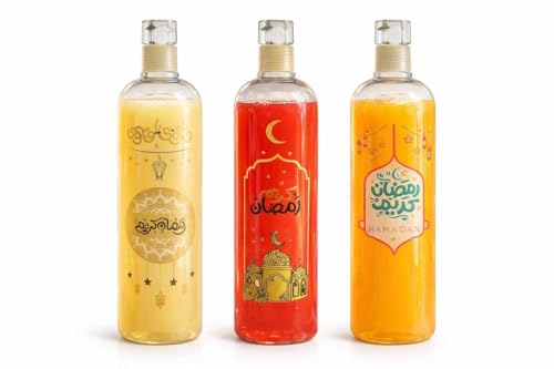 - تصميم رمضاني مميز: زجاجات مزينة بزخارف وعبارات رمضانية تقليدية مع رسومات الفوانيس والأهلة والنجوم لإضفاء أجواء احتفالية على مائدتك