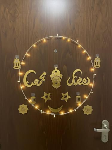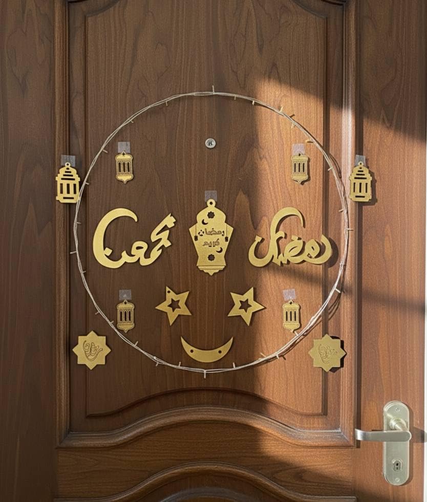 Generic - ديكور رمضان خشبي، رمضان يجمعنا مع دبل فيس، ذهبي، 25x45 سم، 12 قطعة مع فانوس ونجمة وهلال، للأبواب والحوائط
