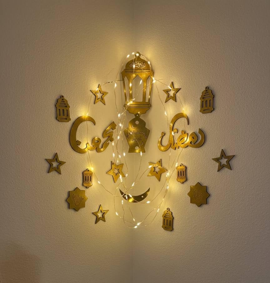 - محتويات المنتج: كارت ديكور خشبي يتضمن 12 قطعة بتصميم رمضان يجمعنا مع أشكال الهلال والنجمة والفانوس لتزيين المنزل خلال شهر رمضان المبارك