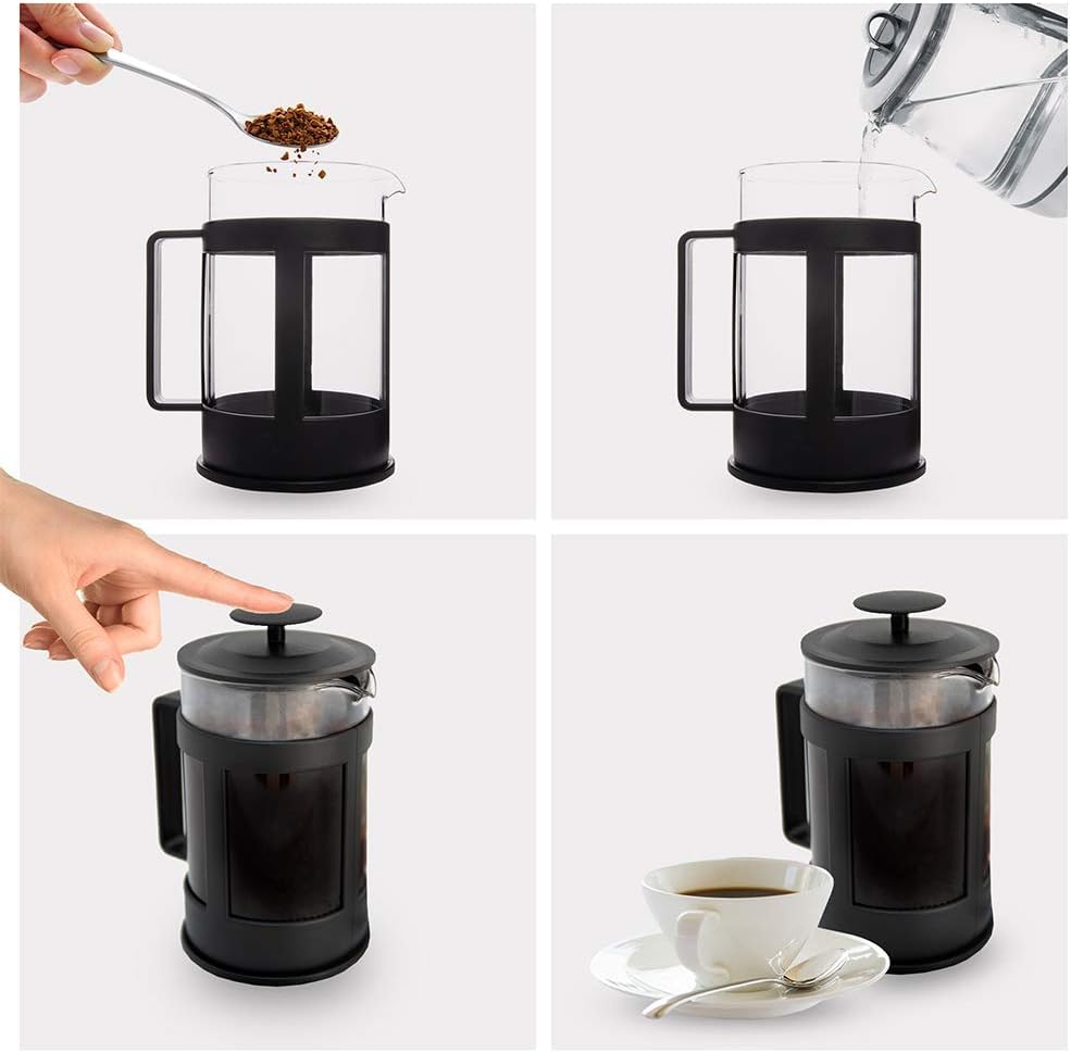 - جودة عالية: ماكينة تحضير القهوة هي عبارة عن مقهى جميل مع زجاج بوروسيليكات آمن غذائيًا وإطار بلاستيكي متين وفلتر متطور من الستانلس ستيل. مقبض ماكينة تحضير القهوة الفرنسية مقاوم للحرارة لمنع الحروق والتعرض للحرارة.