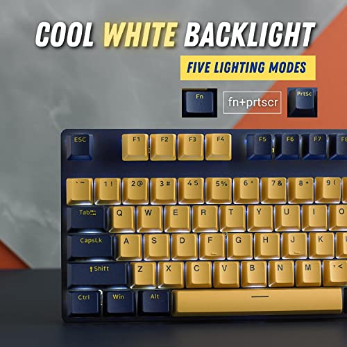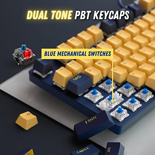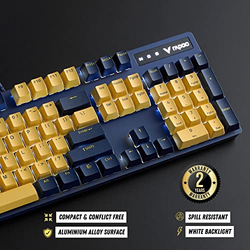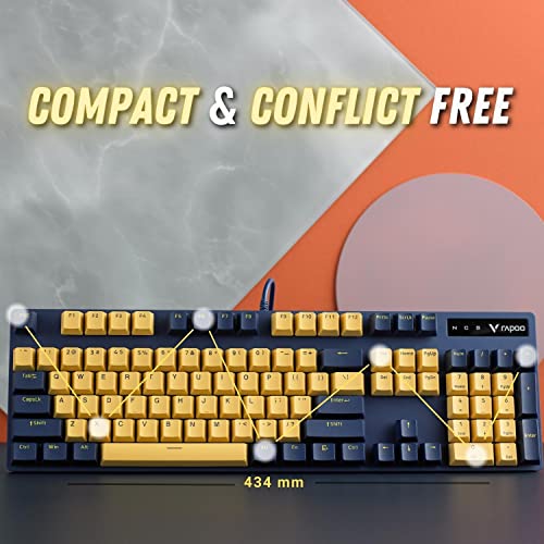 RAPOO - كيبورد ألعاب ميكانيكي V500 برو إصدار بلون أصفر وأزرق مع مفاتيح زرقاء وتصميم مقاوم للانسكاب وغطاء سطح من خليط الألومنيوم من رابو (استخدام كيبورد عربي غير مضمون)