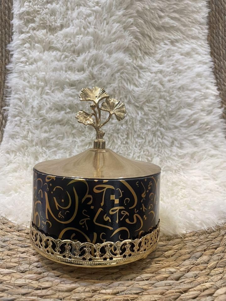 Generic - بونبونيرة عربية نادرة تصميم عربي فاخر مع نقوش كاليجرافي ذهبية، زخرفة معدنية، غطاء مزين بأوراق الشجر (أسود)