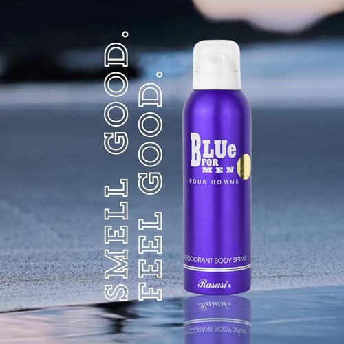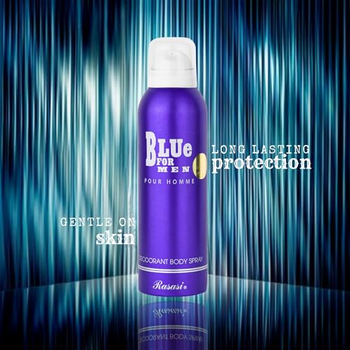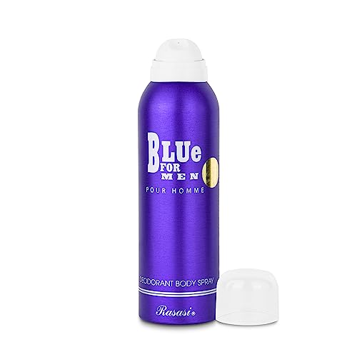 RASASI - مزيل العرق بلو اون وودي للرجال - 200 مل، بخاخ مزيل عرق للجسم، مزيل عرق لطيف على البشرة ويدوم طويلًا للحماية من الروائح من راساسي