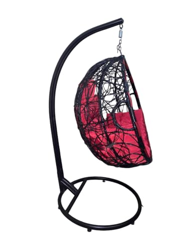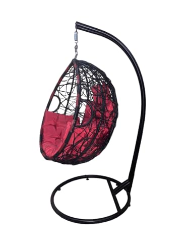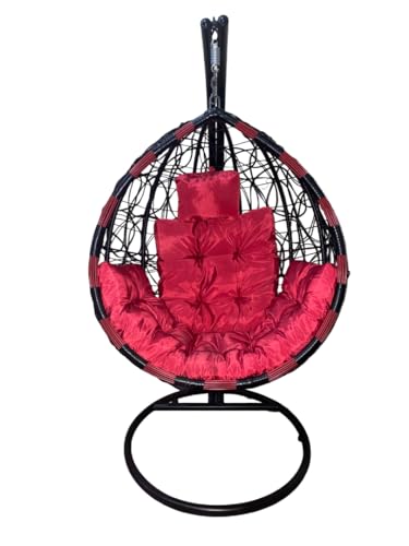 Generic - كرسي أرجوحة معلق راتان بتصميم بيضاوي، أسود وأحمر، مع قاعدة معدنية ووسادة مبطنة واحد فرد يحتوي على 2 عامود لزياده الامن والمتانه