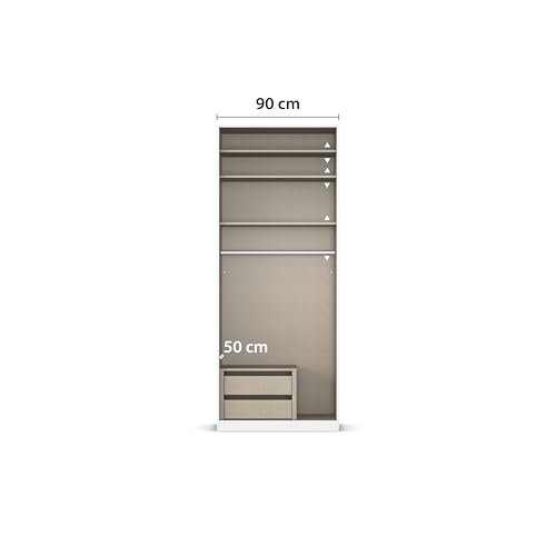 - خزانة بأبعاد 90 سم عرض × 2.29 متر ارتفاع × 54 سم عمق، توفر مساحة تخزين واسعة خلف بابيها تتسع للملابس أو منتج مفضل آخر. الجزء الداخلي من الخزانة مقسم إلى مقاس 90 سم.