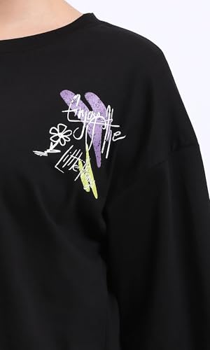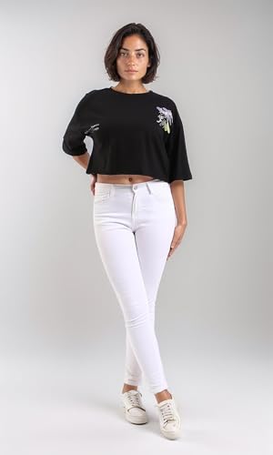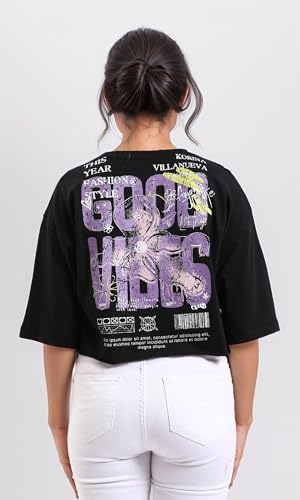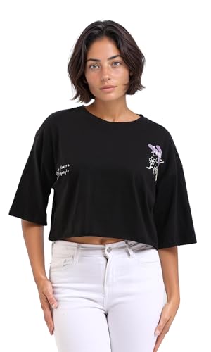 Dsisskai - تيشرت قصير مطبوع باكمام كوع للنساء من ريفين - اسود، مقاس L