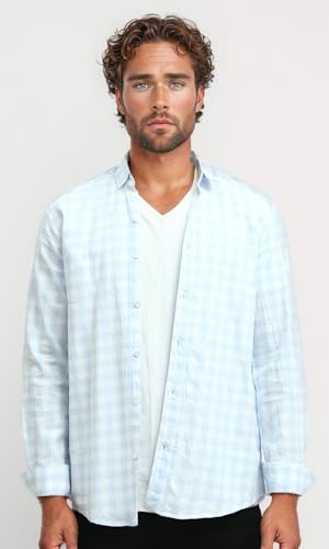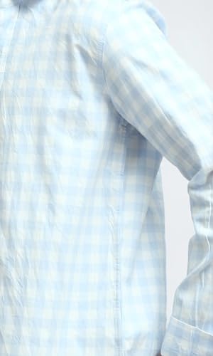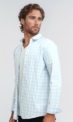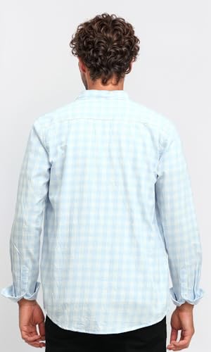 Ravin - ريفين قميص كارو باكمام طويلة عصري للرجال بلون ازرق فاتح وابيض