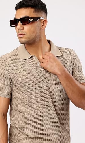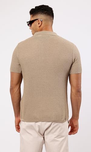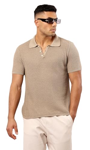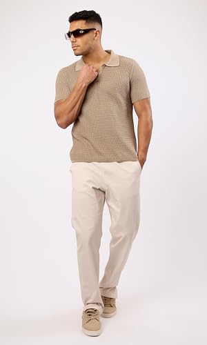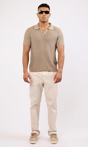 Ravin - تيشرت بولو عصري للرجال بتصميم منسوج برقبة بأزرار من ريفين، بيج غامق