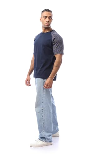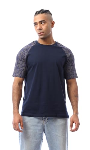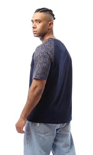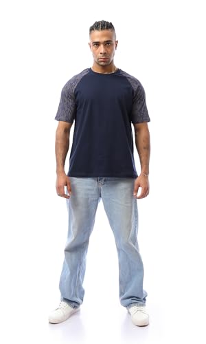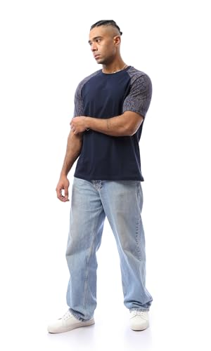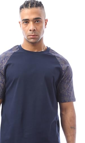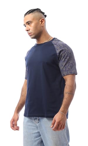 Ravin - ريفين تيشرت قطن باكمام منقوشة للرجال بلون ازرق كحلي وموكا عصري