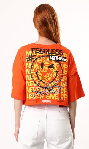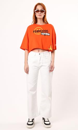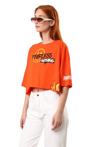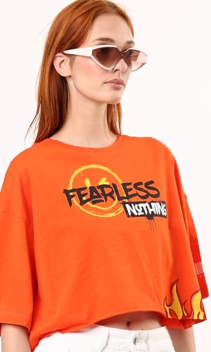 تيشرت فضفاض مطبوع عليه "Fearless Nothing" - برتقالي فاقع