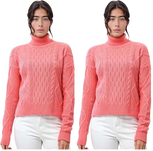 Ravin - ريفين بلوفر بقصة عادية ورقبة مرتفعة للنساء - لون مرجاني، بينك، مقاس L (عبوة من قطعتين)