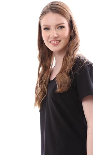Ravin - ريفين تي شيرت نسائي اسود باكمام قصيرة سهل الارتداء بحاشية على شكل حرف U عصري