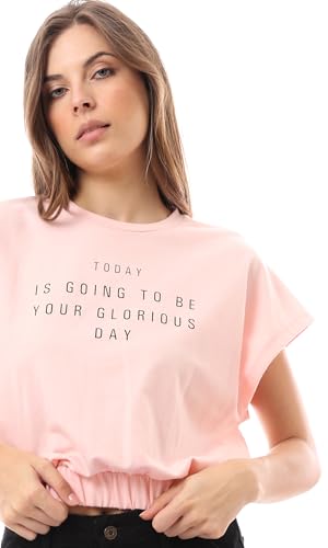Ravin - ريفين تي شيرت عصري باكمام قصيرة على الكتف مزين بطبعة وردية مع حاشية مرنة