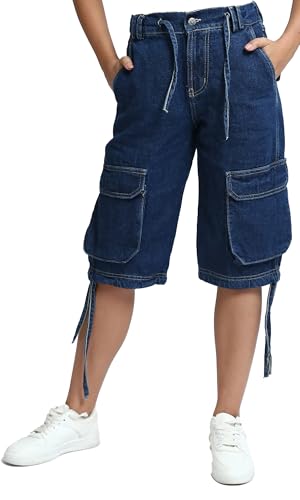 Ravin - ريفين شورت كاجوال متعدد الجيوب برباط جانبي للنساء - بنطلون جينز داكن