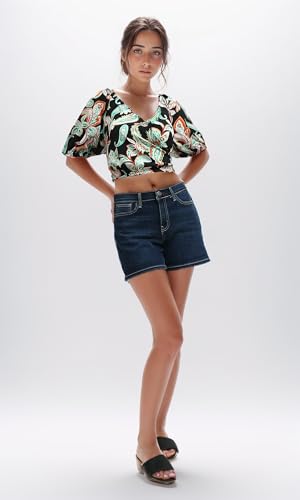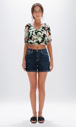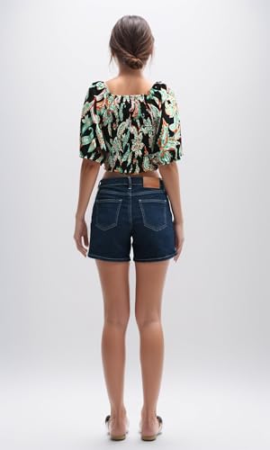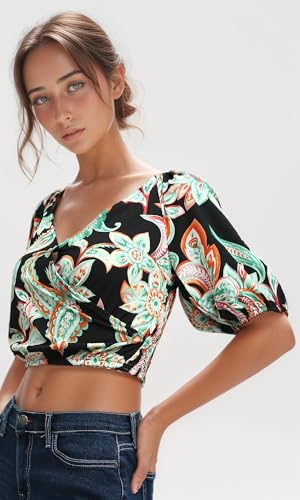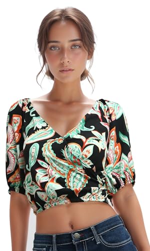 Ravin - ريفين توب قصير باكمام قصيرة واستك عند الخصر للنساء - اسود واخضر عصري