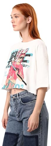 Ravin - تيشيرت حريمي قطن عصري مطبوع من ريفين، بأكمام كوع بلون أبيض (اوف وايت)