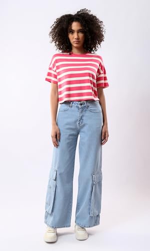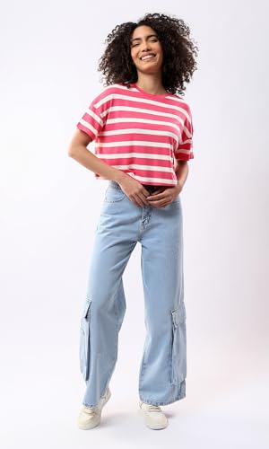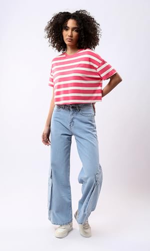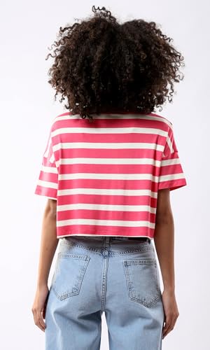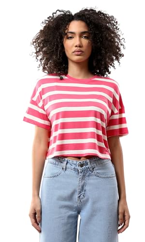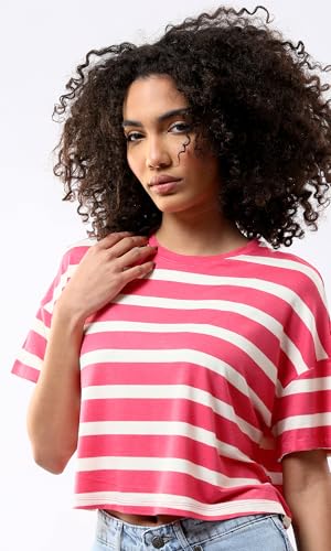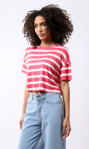 Ravin - ريفين تيشرت قصير مخطط باكمام قصيرة للنساء بلون فوشيا وابيض
