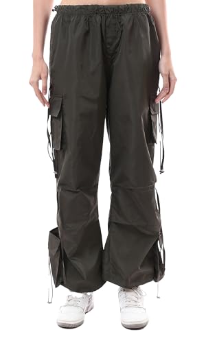 بنطلون كارجو خفيف الوزن بأرجل واسعة بلون زيتي غامق