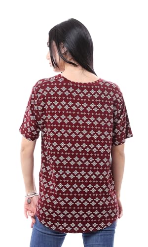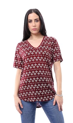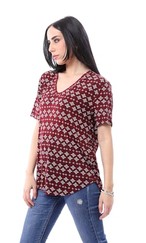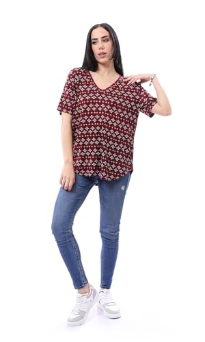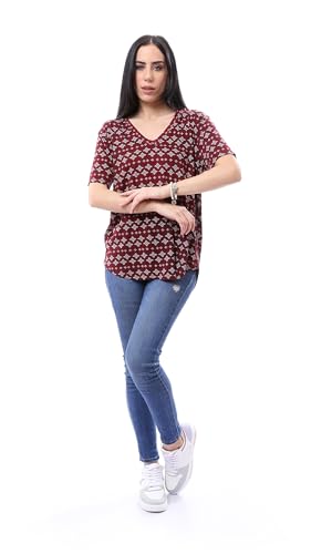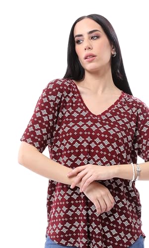 Ravin - ريفين بلوزة نسائية واسعة برقبة شكل V منقوشة بورغندي منفوش عصري