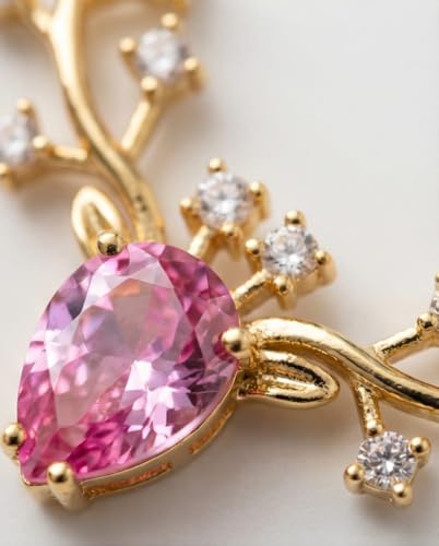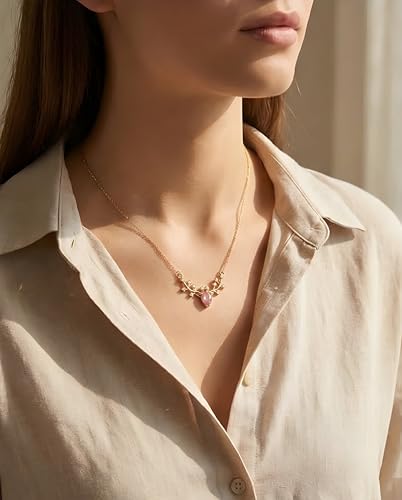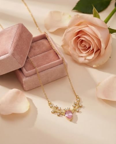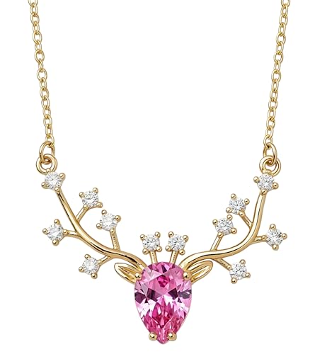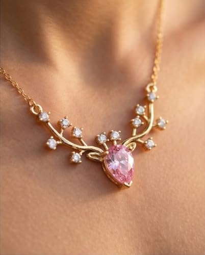 Rawnq - عقد انيق بتصميم قرن غزال مطلي بالذهب مع حجر كريستال بينك للنساء من راونكيو