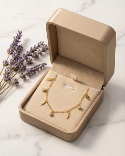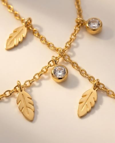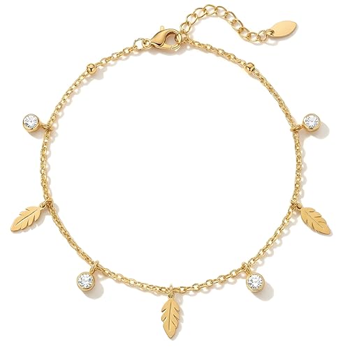 Rawnq - خلخال ذهبي للنساء من راونكيو - خلخال انيق بدلاية على شكل ورقة شجر، سلسلة قابلة للتعديل مع دلايات كريستال، مجوهرات شاطئ صيفية خفيفة الوزن هدية للنساء والفتيات